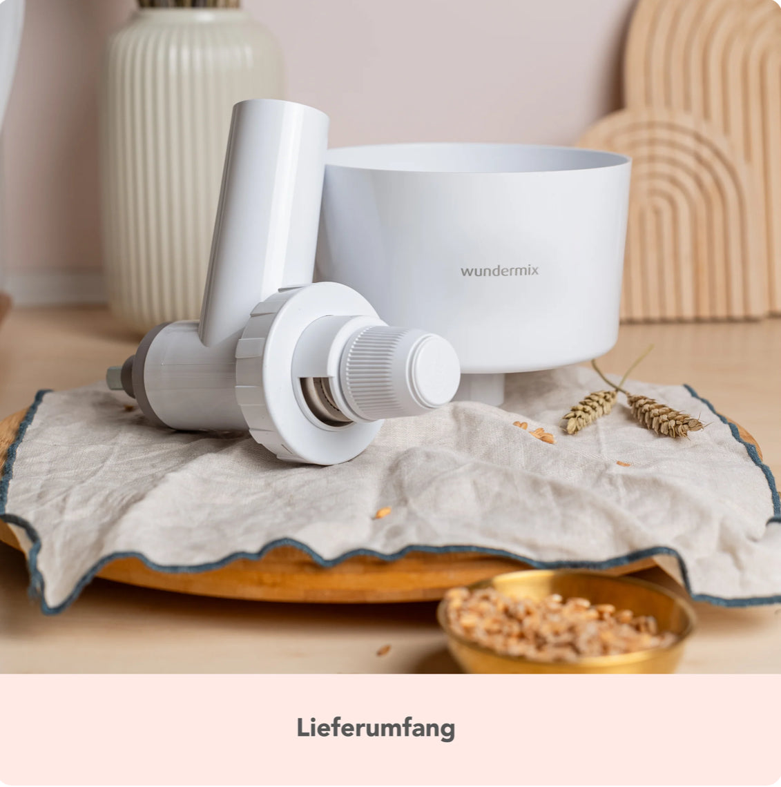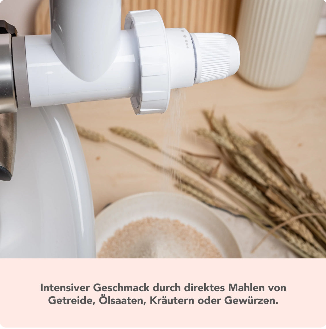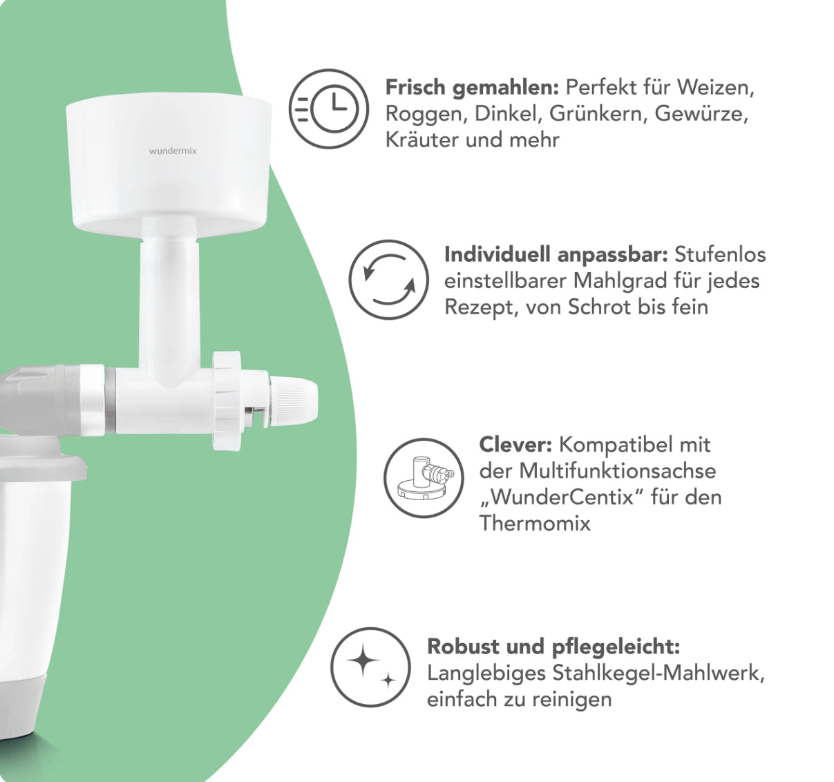 Mit der Getreidemühle für WunderCentix® kannst Du frisches Mehl aus Getreide mahlen und dabei selbst entscheiden, wie fein oder grob es sein soll. Perfekt für eine bewusste Ernährung! Ob Getreide, Ölsaaten, Kräuter oder Gewürze – frisch Gemahlenes überzeugt durch ein starkes, unverfälschtes Aroma.