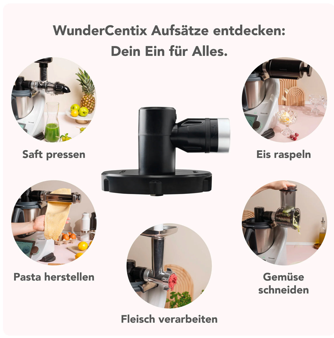 Mit der WunderCentix Multifunktionsachse wird Dein Thermomix zum echten Alleskönner – ideal für alles von Pasta über Fleischverarbeitung bis hin zum Entsaften. Einfach die Achse einsetzen und einen der vielen praktischen Aufsätze anbringen. So wird Deine Küche im Handumdrehen zur Chefküche!
