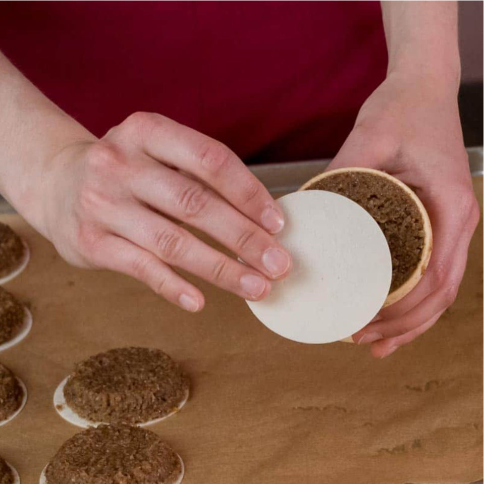 So einfach gehts: Teig mit einem Teigschaber in die Lebkuchenform einstreichen. Oblate leicht aufdrücken. Das Oberteil der Lebkuchenglocke drehen und den Lebkuchen auf das Backblech fallen lassen. Die Lebkuchenglocke ist so konzipiert, dass der Lebkuchen nach dem Backen die ganze Oblate bedeckt.