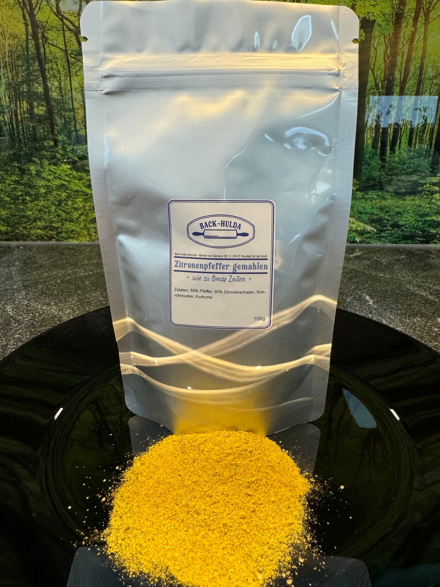 50% Pfeffer, 30% Zitronenschalen, Rohrohrzucker, Kurkuma.