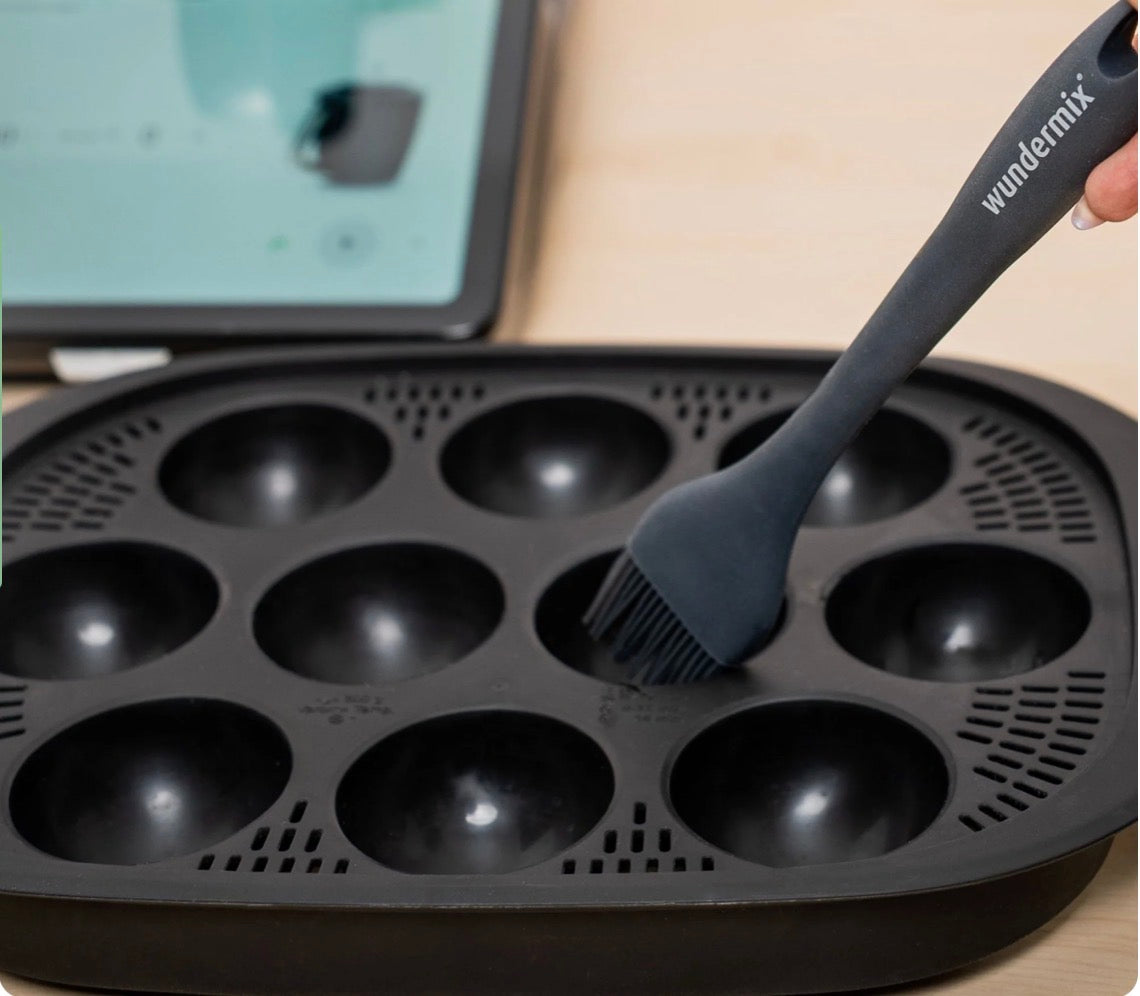 Sauber einpinseln statt kleckern. Der Silikonpinsel ist Dein zuverlässiger Küchenhelfer für präzises Einfetten, Glasieren und Marinieren. Er verteilt Öl, Butter oder Glasur gleichmäßig und sorgt für einen hauchdünnen Film, ohne Tropfen und ohne verlorene Borsten im Teig. Besonders stark ist er in Kombination mit Gugelix, WunderPoach oder Muffinizer: einpinseln, befüllen, lösen – nichts bleibt haften. Das nahtlose Silikondesign ist hygienisch, langlebig und spülmaschinengeeignet. In dezentem Grau fügt sich der Pinsel harmonisch in Deine Küche ein und passt optisch ideal zur Wunderspatel-Serie.