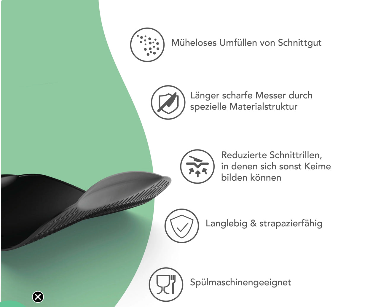 - Mühelose Umfüllen von Schnittgut: einfach rüber in den Mixtopf oder die Pfanne dank praktischer Griffe und flexiblem Material