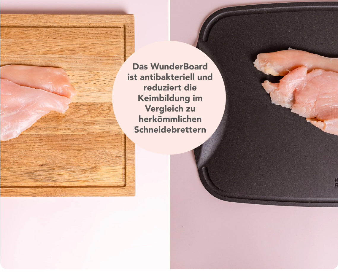 Du legst Wert auf Sauberkeit und Hygiene in Deiner Küche? Unser WunderBoard® ist antibakteriell und reduziert übliche Schnittrillen, die bei herkömmlichen Schneidunterlagen zur Keimbildung neigen. Du kannst es ganz einfach in der Spülmaschine reinigen oder ca. 30 Sekunden in kochend heißem Wasser sterilisieren.