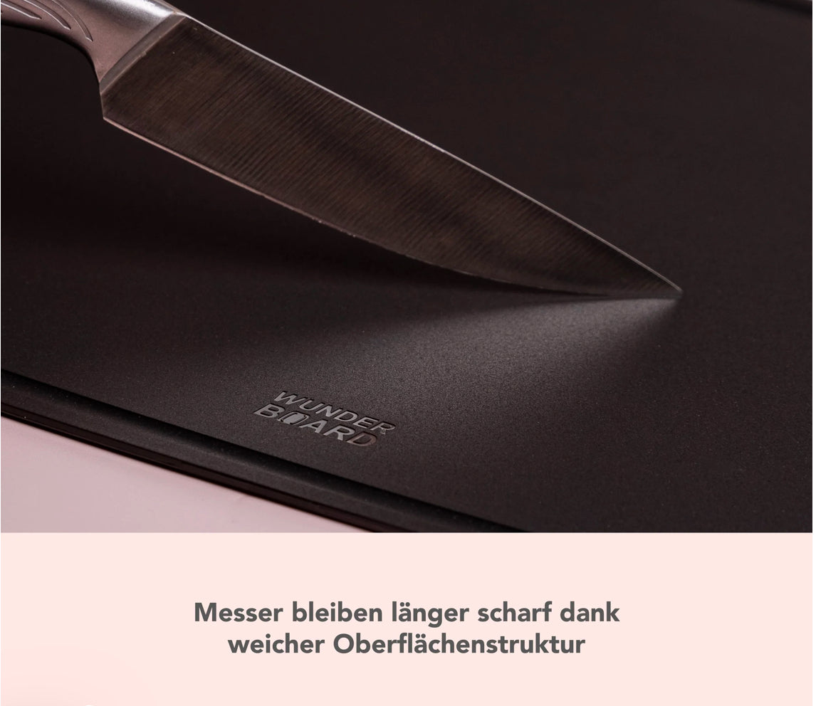 Als Kochbegeisterter weißt Du, wie wichtig scharfe Messer sind. Tomaten, Fisch und Fleisch schneiden sich mühelos, wenn die Klingen scharf bleiben. Gute Nachrichten! Die weiche und unempfindliche Materialstruktur des WunderBoard® schont Deine Klingen, sodass Deine Messer länger scharf bleiben. Ein weiteres Highlight der speziellen Materialzusammensetzung ist, dass sich deutlich langsamer als bei herkömmlichen Holzbrettern unschöne Kratzer und Abnutzungserscheinungen bilden. So sorgt Dein WunderBoard® für langanhaltende Freude an Deinen Messern und bleibt optisch ansprechend.