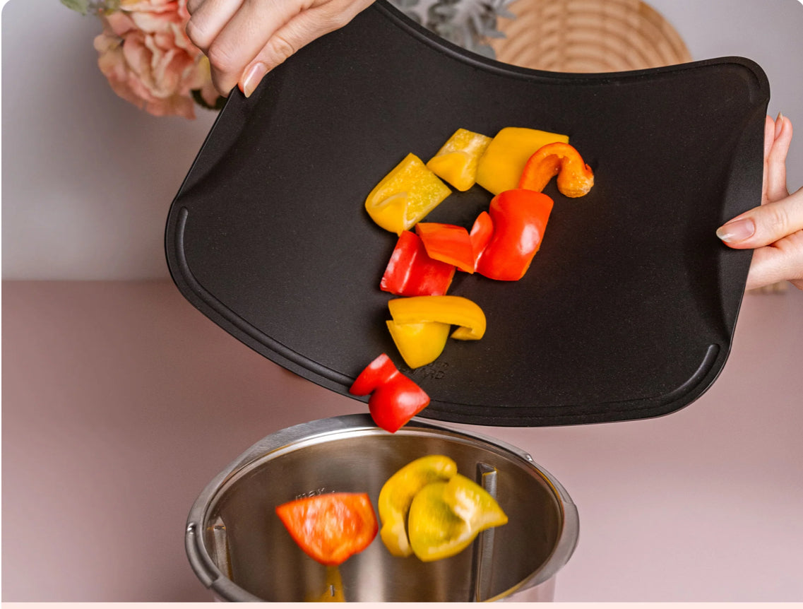 Mit dem WunderBoard® kannst Du Deine geschnittenen Zutaten mit nur einem Handgriff direkt in den Mixtopf oder die Pfanne befördern – ohne kleckern. Das biegsame Schneidebrett lässt sich an den durchdachten Griffen bequem zur praktischen Schütte formen. Schnell, mühelos und sauber – so macht Kochen Spaß!