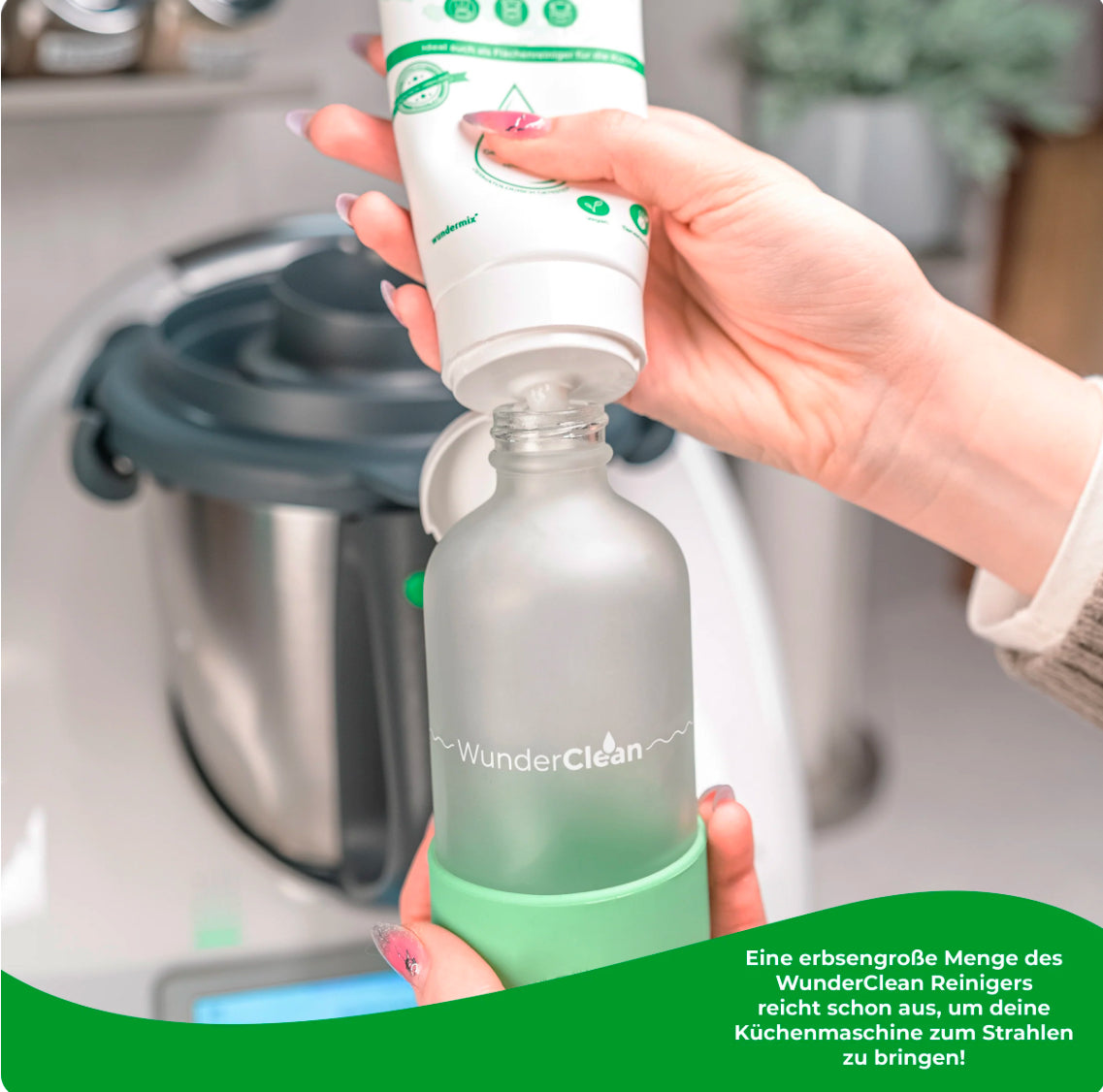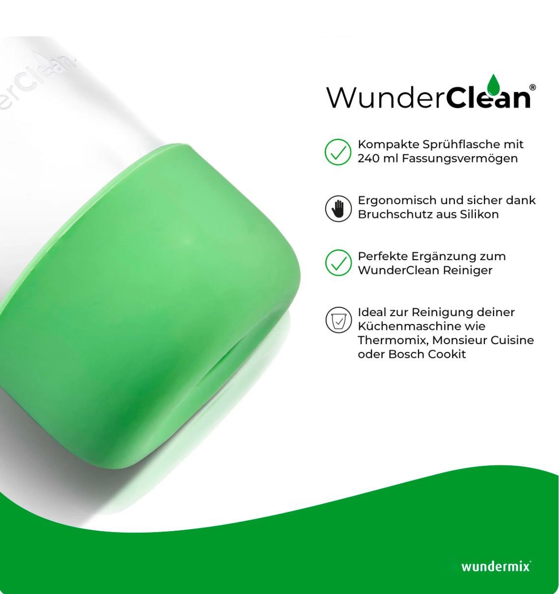 Flasche auffüllen, Flecken anvisieren und ruckzuck ist die Küche strahlend sauber: Mit WunderClean und unserer neuen Sprühflasche gehören Verschmutzungen auf dem Kochfeld, im Thermomix, dem Monsieur Cuisine oder auch im Backofen der Vergangenheit an.