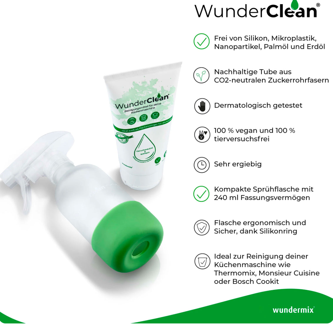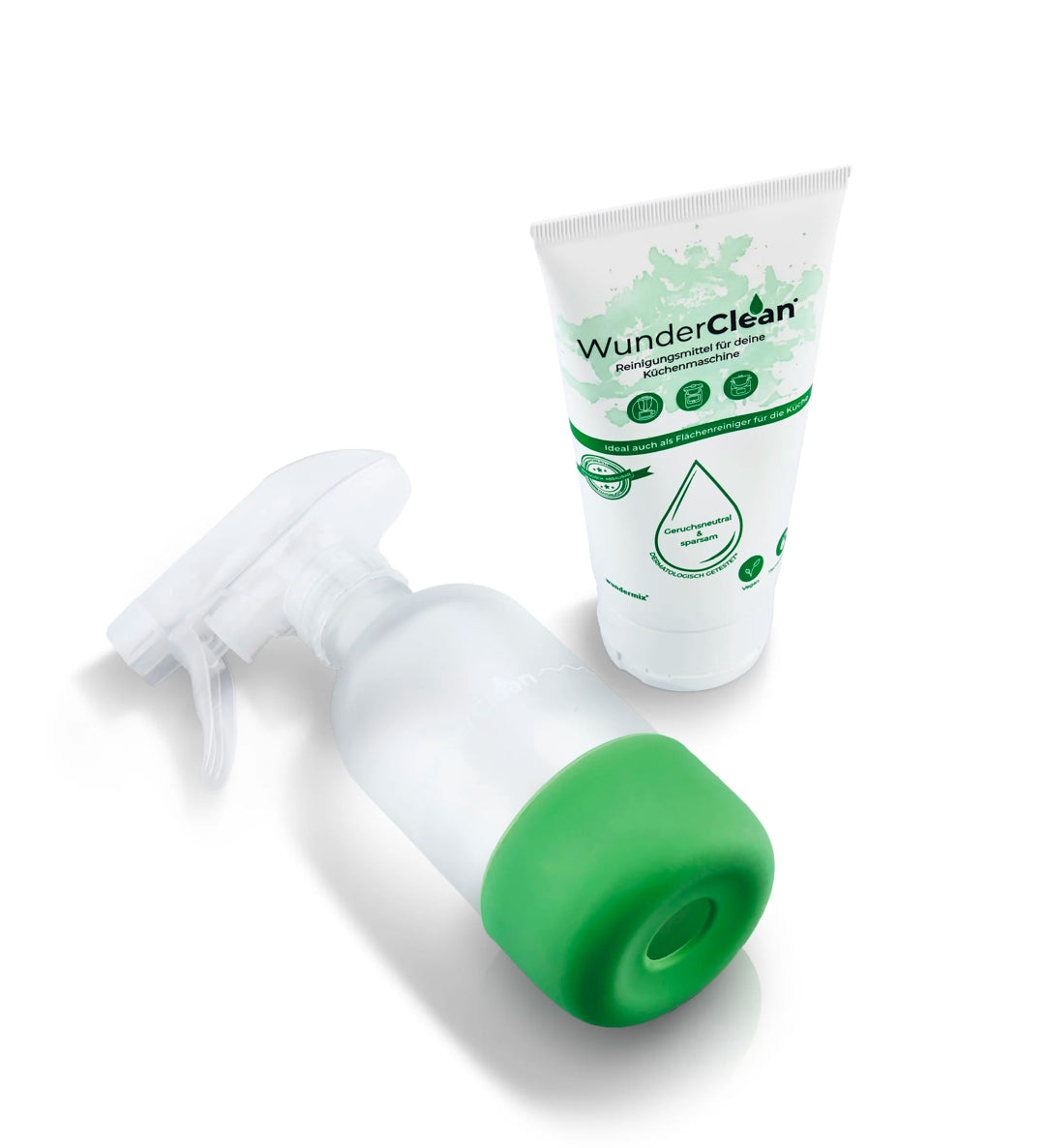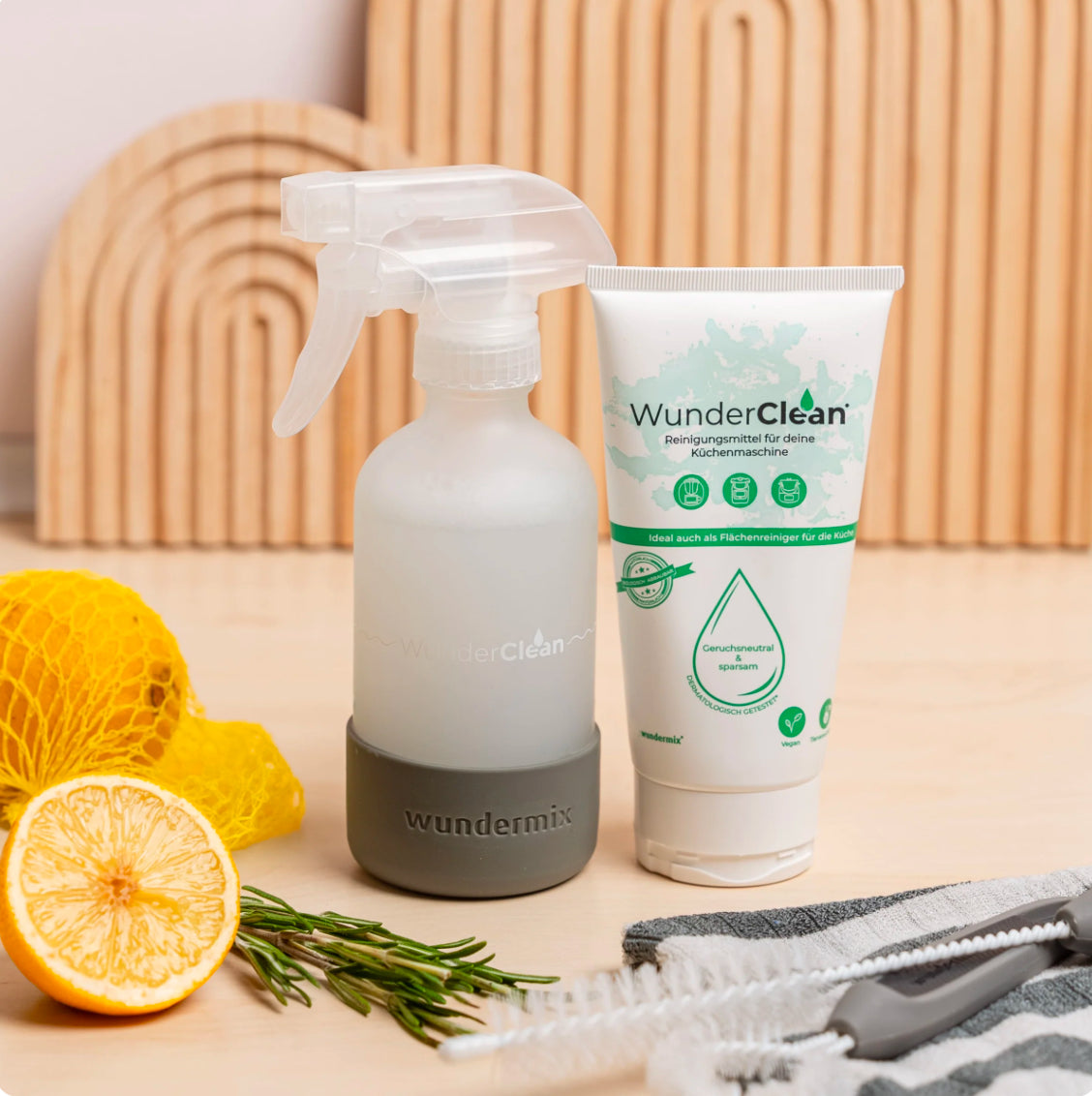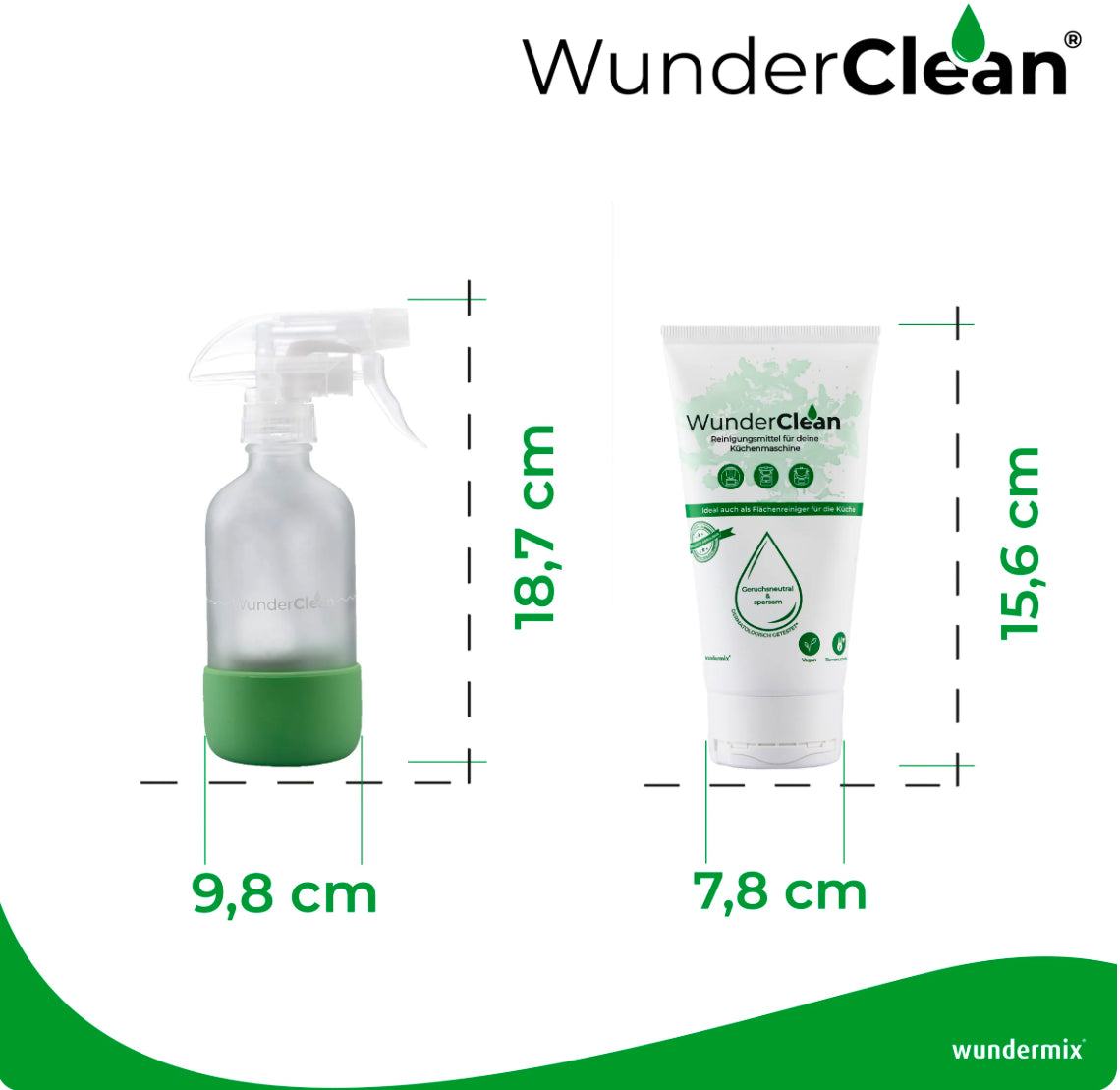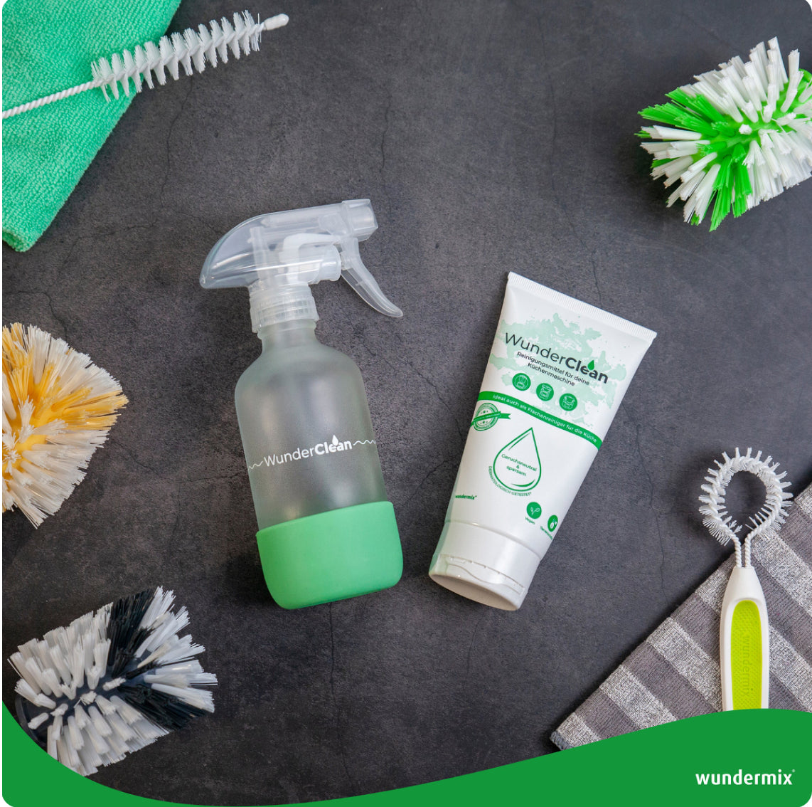 Für die Wundermix-Reinigungspaste „WunderClean“ stellen selbst starke Verschmutzungen in der Küche kein Hindernis da. Einfach eine erbsengroße Menge in unsere dazu passende Glasflasche geben und bis zur Markierung mit lauwarmem Wasser auffüllen (ca. 120-140 ml).